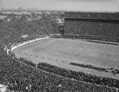 The undefeated Texas A&M Aggies are facing off against the Tulane Green Waves in the 1940 Sugar Bowl. The game is being held at Tulane Stadium. A photograph from the top of the stadium shows the packed New Years crowd. Around 73,000 fans are in attendance. The Aggies went on to win the game 14-13 after two rushing touchdowns from fullback, John Kimbrough. With a perfect 11-0 season, the Texas A&M Aggies were named National Champions.