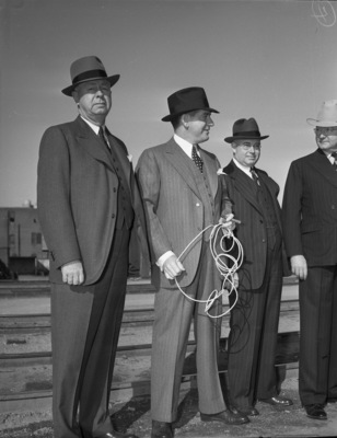 Chrysler Corporation executives (left to right) F. H. Akers, vice president of the Dodge division; A. vanDerzee, vice president of Chrysler, and T. J. Ross, public relations counsel. The men are standing in front of railroad tracks, all wearing striped suits and hats. An unidentified man is standing at the far right, wearing a pinstripe suit, a hat and eyeglasses. Mr. Ross is holding up a slightly tangled piece of rope and a cigar in his left hand.