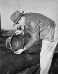 Coleman County, Texas, is enjoying a renewal of activity with the discovery of the Coker Oil Pool. H. T. Owen is stationed at Number Three Coker. He is shown testing oil from the well. Mr. Owen is dressed in a hat, leather jacket, and trousers.