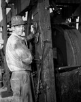 Coleman County, Texas, is enjoying a renewal of activity with the discovery of the Coker Oil Pool. Working on one of the rigs is driller J. T. "Buddy" Bennett. He is wearing a hat, collared shirt, and trousers.