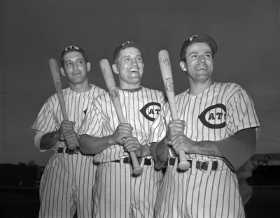 The Fort Worth Cats' wrecking crew are left to right, Henry "Prince" Oana, Walter Cazen, and Joe Abreu. The three right-handers are the Cats' biggest power threat and the main reason foes won't save lefties for the Cats. Outfielder, Oana contributed a homerun to the game. Cazen, also an outfielder, blasted out of his slump ringing in two doubles and a single. Abreu is leading the league in both homeruns and runs batted in. They are standing in a line with a Louisville Slugger bat over their shoulders. The Cats are dressed in their home pinstripe uniforms.