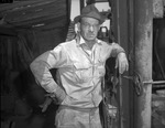 One of the busiest spots in West Central Texas is the Wimberly district in Southern Jones County. Oil worker I. E. Garbro is a driller on the S. C. Herring number one Hardy. He is shown leaning against a pipe, dressed in a hat, button-up shirt, gloves, and trousers.