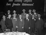Officials of the Chrysler Corporation who were luncheon hosts to 300 dealers in this area were presented with Shady Oak hats at the conclusion of their addresses and conferences on business conditions. Shown here in this picture are Dealers conference attendees (Front row, left to right) Arthur West; Fort Worth, Texas; Steve Cooke; A. Van DerZee; T. J. Ross; A. B. Couture; H. B. Ransom; and C. L. Jacobson. (Back row, left to right) L. D. Cosart, K. T. Keller; L. G. Peed; F. H. Akers; and L. L. Colbert.