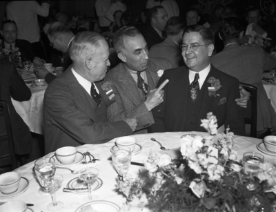 Officials of the Chrysler Corporation who were luncheon hosts to 300 dealers in this area were presented with Shady Oak hats at the conclusion of their addresses and conferences on business conditions. Shown here in this picture are Dealers conference attendees (left to right) Rec Thomson of Austin, Texas; Joe N. Mitchell of Waco, Texas, both Dodge dealers, converse with L. G. Peed.