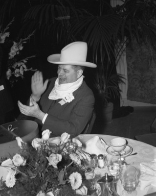 Officials of the Chrysler Corporation who were luncheon hosts to 300 dealers in this area were presented with Shady Oak hats at the conclusion of their addresses and conferences on business conditions. Shown here in this picture is Chrysler Dealers conference attendee K. T. Keller, who smiles broadly after being presented with a hat.