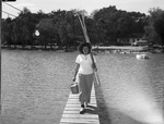 Miss Betty Conrade is off to an early start to inaugurate a new fishing season at Lake Worth. She is carrying two fishing poles and a bucket as she walks down the dock. Miss Conrade is hoping to catch a fish on each pole to open the season at Shady Grove Camp. She is dressed in a wide-brimmed hat, t-shirt, and cuffed trousers.