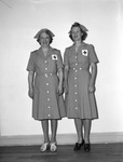 Among the first volunteers to wear the new Red Cross uniforms, left to right, are Mrs. George Bond and Mrs. William Faversham Junior. Mrs. Bond is a home service worker and the wife of Major Bond of the Flying Training Command. Mrs. Faversham is a staff assistant with the Red Cross.