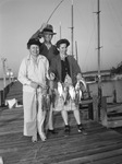 The fishing season opened at midnight on Eagle Mountain Lake. Three fishermen found the crappie biting from the docks at the Boat Club. Inaugurating the new season, left to right, are Mrs. Ruth Hare, H. E. Oakes and Mrs. H. E. Oakes. They are shown proudly displaying their bounty. Mrs. Hare pulled out the first fish, 14 minutes into the season. She is wearing a peaked cap, jacket, and trousers. Mr. Oakes is dressed in a hat, collared shirt, sweater, and trousers. Mrs. Oakes is wearing a sweater, coat, and a plaid skirt.