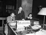 The Tarrant County War Bond Drive has exceeded their original goal of $25 million. Pictured left to right, are C. W. Garrard, J. Lewell Lafferty, and Miss Ruby George Trussell. Mr. Garrard is with the bond department of the Fort Worth National Bank. He is dressed in a suit. Mr. Lafferty is the War Finance Committee chairman. He is wearing a three-piece pinstripe suit. Miss Trussell is an employee of the First National Bank in the trust department. She is wearing a dress with a lace collar. The group is sitting behind a desk. On the desk are stacks of documents and books and a sign advertising their funding goal. At the far right is a desk lamp.