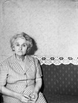 Mrs. Fruzie P. Moore came to Fort Worth, Texas, in 1881 from Tennessee. She was the youngest daughter of Mr. and Mrs. Hiram G. Morton. Mrs. Moore, now 69, has lived in Fort Worth for 62 years. Mrs. Moore is shown sitting on a couch. She is wearing a striped, button-up blouse and a matching skirt. Her oldest brother is Tommie Morton. She has two daughters, Mrs. Ruby Pollard Brandt and Mrs. Jennie Pollard Glenn.
