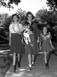 The Girl Scouts are holding their May Day Court of Awards. Walking down the flower lane, left to right, are Miss Joice Puckett, Miss Pricilla Thomason, and Miss Sandra Jo Hampton. Miss Puckett is wearing a button-up blouse, pleated skirt, and a lei around her neck. She acted as maid of honor. Miss Thomason is dressed in her scout's uniform. Miss Hampton acted as the other maid of honor. She is wearing a button-up dress and a lei.