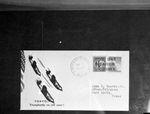 This envelope features a unique railway post-office cancellation stamp with the phrase "One Day Nearer to Victory." The envelope was furnished by Carl L. McCluney, of Fort Worth, Texas. He sent it to the Stamp Editor, John S. Sparks Junior, at the Fort Worth Star-Telegram. In addition to the stamp, the envelope features a drawing of three bombers with the phrase, "Tokyo: Triumphantly we will come!"