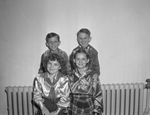 The Riverside Elementary School Mixed Chorus will entertain the Lions Club at a joint dinner Monday night. Four singers with the 120 member chorus, left to right, are (bottom row) Betty Hill and Charldean Housewright, (top row) Roy Jack Finney and Larry Guinn. Betty is wearing a shiny button-up blouse, scarf, and a skirt. Charldean is dressed in a a shiny button-up blouse, scarf, and a plaid skirt.