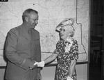 Major General Harvey F. Hazlett is shown greeting Hallie B. Mallery. General Hazlett served as a machine gun officer during World War I. Mrs. Mallery was an employee with the Quartermaster Corps at the same time. They are both still serving. General Hazlett is the commanding general of the Replacement and School Command Army Ground Forces. He is dressed in his military uniform. Mrs. Mallery is the oldest employee at the Fort Worth Quartermaster Depot. She is wearing a hat, floral dress, and gloves. There is a map hanging on the wall in the background.