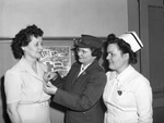 The Circle Park Parent Teacher Association (P. T. A.) is participating in the Red Cross Home Nursing. Pictured left to right are Mrs. Grover Swift, Mrs. J. H. Wilson, and Mrs. Wyman Glenn. Mrs. Grover is the war chairman of the Circle Park P. T. A. She is wearing a button-up blouse and a skirt. Mrs. Wilson is the home nursing chairman. She is dressed in a Red Cross uniform as she is shown attaching a pin to Mrs. Swift's lapel. Mrs. Glenn is an instructor with the Red Cross. She is also dressed in a uniform.