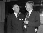 The Texas State Medical Society is holding a two-day convention in Fort Worth, Texas. During one of the meetings they elected new officers. In attendance, left to right, are Dr. Tom G. Glass and Dr. C. S. Venable. Dr. Glass, of Marlin, Texas, is the society's new vice president. He is dressed in a double breasted, pinstripe suit. Dr. Venable, of San Antonio, Texas, is the new president. He is wearing a suit.