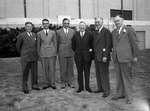 Swift and Company officials from Chicago, Illinois, and San Antonio, Texas, at Will Rogers Auditorium in Fort Worth, Texas. They are, left to right, J. D. Campbell, Oscar Hild, E. D. Kodel, A. F. Hunt, J. H. Hall and J. O. Gunn. The group of men are standing outside the auditorium building. Each of them are dressed in suits; some are pinstriped while others are double-breasted. Hunt, Hall and Gunn are also wearing eyeglasses. Most of the men are smiling or laughing at the camera.