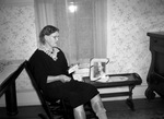 Mrs. D. B. Beverly sitting in a rocking chair, reading a Mother's Day letter from her son, Sergeant D. B. Beverly Junior, who is in Egypt. She is wearing a dark dress with a lace collar. Beside her, at right, is a low end-table with a framed picture of her son in uniform. There is also a curtained window on the wall behind her.