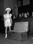 Children of the Lena Pope Home contributed their bit in the $25,000 building fund campaign of the Broadway Baptist Church. One of the children is shown looking on at the trunk used to receive the collection. She is wearing a dress and a hat with stars on it. Behind her are a few seated women looking on.