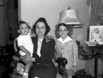 Mrs. A. M. Herman, center, celebrating Mother's Day with her young sons, Donald Sidney Herman, right, and Morton Lee Herman, left. Mrs. Herman is sitting in a chair and holding Morton in her arms. Donald is standing next to his mother. Mrs. Herman is wearing blouse and a dark-colored blazer and skirt. Donald is wearing a collared shirt, a striped suit jacket and shorts. Behind them, at right, is an end-table with a lamp and a framed photograph of an infant on it.