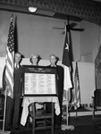 Reverend James A. Walkup, Lieutenant Madia Moorhead and Judge Walker Morris standing behind a roster of Weatherford Street Methodist Church boys who are in the armed forces. Lieutenant Moorhead is wearing her uniform and the two men are wearing suits. At the far left is an American flag, and to the right of the group is a Texas flag and an American flag.