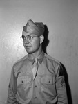 Herbert Thornton, technician fourth grade of an armored division at Camp Beale, California, standing in front of a blank wall. He is wearing his military uniform and looking off to his right. He is also wearing a pair of eyeglasses. He is a former Masonic Home resident, having played center on the 1936 football team there.