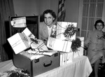 Mrs. Polly G. Corbitt, shown sitting behind a large pile of gifts that are on top of a desk. Also on the table is an open suitcase with more gifts spilling out of it. Mrs. Corbitt is wearing eyeglasses, a blouse and a blazer. In the background is an American flag. An unidentified woman is sitting at the far right, wearing a dress.