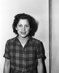 Mrs. Beatrice Pena Johnson shown standing in front of a blank wall, wearing a plaid dress. Her children, Joseph John Johnson Junior, 7, and Henry Clayton Johnson, 4, were adopted in court proceedings in Waco, Texas, by Master Sergeant and Mrs. Jack Sorem so that Mrs. Johnson could join the Women's Army Auxiliary Corps (W. A. A. C.).