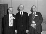 George W. Purnell, of Dallas, Texas, E. Hautcamp, of Pittsburgh, Pennsylvania, and L. S. Lacey, of Denison, Texas, three past grand chancellors who were presented life membership during a Knights of Pythias session in Fort Worth, Texas. The men are shown standing next to each other, all wearing dark suits. Purnell and Hautecamp are also wearing name tags on their jacket lapels. Lacey is wearing a pair of eyeglasses. Behind them is a wall and a window with a patterned curtain.