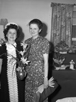 Mrs. C. S. Bigham and Mrs. B. H. Stewart, in attendance at a North Side Garden Club flower show. They are standing next to each other, smiling and looking towards their right. Mrs. Bigham is wearing a knitted hat and a long, short-sleeve dress. Mrs. Stewart is wearing a dress with a leaf pattern and a hat. She is holding a small vase of flowers in her right hand and a pair of gloves and a handbag in her left hand. Behind the women is a small display area with flower arrangements and a window with a floral curtain.