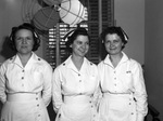 Three Navy nurses assigned to the Eagle Mountain Marine Corps Air Station. They are, left to right, Ensign Lucille Tucker, Ensign Norma Mauldin, and Ensign Barbara Lubus. They are shown standing in front of a window and a fan, all wearing their nurse uniform. Ensign Mauldin is looking off to the right while the other women are looking ahead at the camera.