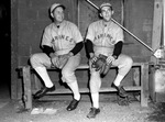 Corporal Charley Buytkus, Marine baseball pitcher (left). Buytkus is shown sitting on a bench with an unidentified teammate, looking to his left and smiling. Both are dressed in baseball uniforms that have their team name, "Marines," across the front of the jerseys. Both are also holding baseball gloves and wearing baseball caps with the letter "M" on them.