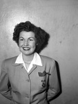 Mrs. Harold Rydell shown standing in front of a blank wall, wearing a collared blouse and a buttoned-up jacket with a small pin attached to one of the breast pockets. She is also wearing a pearl necklace. She is the bride of a Marine.