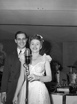 Singers Freddy Terry and Ben Purnell, who joined the Hotel Texas Den dance band orchestra. Miss Terry is standing behind a microphone stand and Mr. Purnell is standing behind her with his left hand on her waist. Miss Terry is wearing a dress with a sweetheart neckline and ruffle sleeves, a floral necklace, a ring and a bracelet on her left hand. Mr. Purnell is wearing a double-breasted suit. Behind the singers are members of the band.