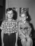 Herbert Barrier Junior (left) and Billy Wayne Barrier, sons of Mr. and Mrs. Herbert Barrier, are co-owners of two $25 bonds. Billy Wayne is shown sitting on small desk as his brother stands next to him. Herbert Junior is wearing a short-sleeve, flannel shirt tucked into a pair of belted trousers. Billy Wayne is wearing a costume that resembles a military uniform.