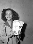 Jo Helen Hale, 9-year-old daughter of Mr. and Mrs. V. C. Hale, shown standing in front of a blank wall. She is holding up the $1,000 war bond she purchased. She is wearing a buttoned-up coat. Jo Helen already owned a $500, a $100 and three $25 bonds which she purchased through the Alexander Hogg School.