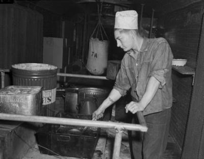 Private Bryant, of Fort Bliss, at El Paso, Texas, serving a meal prepared on the portable stove set up in a box car. He, with other cavalrymen from Fort Bliss, stopped in Fort Worth, Texas, en route to East Texas and Louisiana. He is shown using a ladle in a large, metal container as he leans over the rail that surrounds the cooking equipment. Private Bryant is wearing a rolled up, denim shirt, jeans and a small chef's hat. Also in the box car, in the background, are other pieces of equipment, including a bag that hangs from the ceiling.
