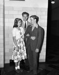 Three Arlington Heights High School students in leading roles in the school's production of the play, "A Wedding." The students are, left to right, Betty Lederer (playing the bride), Gene Saint John (the best man) and Walter Chapman (the groom). The actors are shown standing in front of a brick wall. Betty and Gene are arm-in-arm and facing each other while Walter stands behind them. Walter and Gene are wearing suits. Betty is wearing a floral print dress and a cropped cardigan.