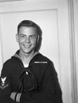 Wayne Barnett, 20, veteran of two and a half years of Navy service that included Pearl Harbor, on his first leave at home in Fort Worth, Texas. Barnett is shown standing in front of a door with his arms crossed. He is dressed in his naval uniform. He is a graduate of North Side High School and the son of Mrs. Gertie Barnett.