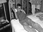 W. J. Little, 10-year-old son of Mr. and Mrs. Jack Little, who sprained his ankles after falling 15-feet from a banister rail outside his second-story bedroom while he was sleepwalking. He is shown lying on his bed, wearing striped overalls.