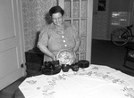Mrs. W. F. Shurtleff displays a set of Japanese-made dishes she is donating to the Moslah Shrine Temple's war bond auction. She is standing behind a round wooden table with her collection of plates and cups set in front of her. She is holding a dish that has an intricate design painted on it. Mrs. Shurtleff is wearing a short-sleeve dress and a pair of eyeglasses. Behind her is an open door that leads into another room of the house in which part of a bicycle can be seen.