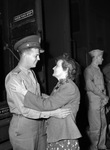 Army Lieutenant Hugh Longmoor and his mother, Mrs. H. W. Longmoor. Lieutenant Longmoor is wearing his military uniform and his mother is wearing a coat over a floral print dress and a pair of eyeglasses. They are facing each other and smiling. In the background, at right, is an unidentified man in a military uniform, facing right.