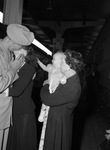Army Lieutenant Joe Henry being greeted by his family as he steps off a train. Lieutenant Henry is kissing his wife, Mrs. Henry, as their infant daughter, Carol Ann Henry, and Mrs. L. M. Patterson look on. Mrs. Patterson is carrying Carol Ann. Henry is dressed in a military uniform and Mrs. Henry is wearing a dark-colored coat and skirt. Mrs. Patterson is wearing a coat over a floral print dress. Carol Ann is wearing a lacy dress and has one arm stretched out towards her mother.