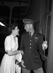 Army Lieutenant and Mrs. D. F. Sumner facing each other and smiling. Lieutenant Sumner, right, is wearing his military uniform. There is a bandage around his ring finger on his left hand. Mrs. Sumner is wearing a short-sleeve dress that is belted at the waist and has a pleated skirt. She is carrying two handbags and holding a pair of gloves in her left hand.