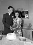 Newlyweds Mr. and Mrs. Billy Jeff Camsey, who were married May 15, 1943. Mrs. Camsey is the former Miss Kitty Lynn Key. The Camseys are holding a knife together over a cake on a dining table. Also on the table are napkins and a stack of plates. Mrs. Camsey is looking directly at the camera while Mr. Camsey looks at her. Mrs. Camsey is wearing a floral print dress with a large flower accessory pinned near the collar and a necklace. Mr. Camsey is wearing a dark, double-breasted suit with a small flower pinned to the jacket lapel. Behind the couple is a small cabinet and a rectangular mirror hanging on the wall.