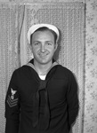 J. C. Hall, wounded United States Navy sailor. Hall is shown standing in front of a wall with his left arm behind his back. He is wearing his sailor's uniform.