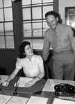 Sergeant Frank Tolbert and Miss Nell Lettrelle. Miss Lettrelle, left, is sitting at a desk while Sergeant Tolbert stands beside her. She is facing Sergeant Tolbert. Sergeant Tolbert is wearing a military uniform and Miss Lettrelle is wearing a short-sleeve blouse. On the desk in front of Miss Lettrelle are various office supplies, including fountain pens, a telephone, and various documents. In the background are two windows.