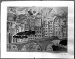 Cityscape drawing by James Hitt (not pictured), 14, ninth grade student at William James Junior High School. The drawing depicts a skyline of several buildings and a bridge. Written on the bottom right corner of the mat board frame is "James Hitt - 9th Grade - Age 14," and beneath that, "William James Junior High School." The drawing won first place in the Children's Art Show held by the Fort Worth Art Association.