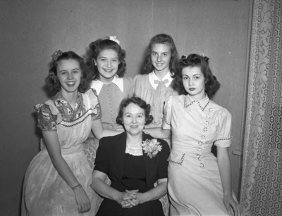 Pledges to the Chi Delta Chi sorority who were initiated at the home of the president, Miss Dorothy Bryant (not pictured). Standing around a chair, left to right, they are Misses Zelma Jeter, Janice Downs, Mary Frances Manchester and Phyllis Jean Montgomery. Seated in the chair is Mrs. C. S. Youngblood, the sorority mother. Miss Jeter is wearing a dress with a Western themed print and a sheer polka-dot overlay. Miss Downs is wearing a dress with a wide collar and buttons down the front. Miss Manchester is wearing a striped dress with a bow tied at the collar. Miss Montgomery is wearing a dress with buttons down the front, off-centered, and plaid trim along the collar and edge of the sleeves. Mrs. Youngblood is wearing a dark-colored dress with lace trim along the neckline and a blazer. Pinned to the blazer is a corsage.
