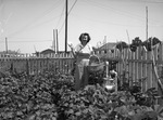 Victory Garden. Mrs. Grady Langley. Mrs. Langley is shown holding up a squash in her backyard garden as she smiles at the camera. She holds a woven basket in her other hand and is dressed in a pair of overalls. Surrounding her are other planted crops and a picket fence.